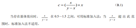 測(cè)定待測(cè)試樣的吸光度為A,從校準(zhǔn)曲線上查得濃度為x。再向待測(cè)試樣中加入標(biāo)準(zhǔn)溶液,加標(biāo)濃度為s,測(cè)定其吸光度為B,從校準(zhǔn)曲線上查得濃度為y。按照公式(B.1)計(jì)算待測(cè)試樣的濃度c: