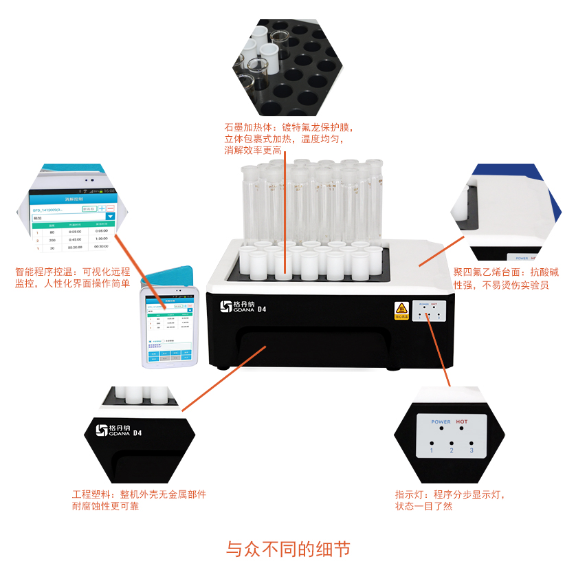 D4智能石墨消解儀采用高純石墨材料作為加熱體,包裹式加熱,效率更高,溫度均勻性更好。多孔設計,輕松實現樣品的批量處理,是您樣品消解的好伴侶。