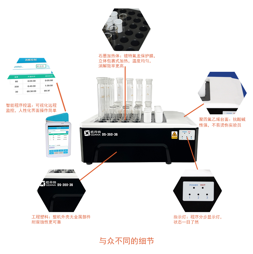 石墨體表面噴涂特氟龍涂層,易清潔,耐腐蝕,整機外圍無金屬部件,可在強酸強堿等腐蝕環境中放心使用。36孔設計,可批量消解,操作簡單省時。