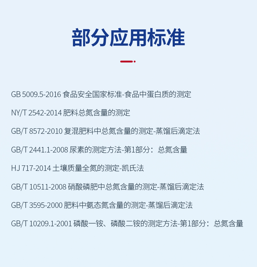 儀器采用凱氏定氮法的原理,用于食品、藥品、水產品、乳制品、化工、土壤、淤泥、谷物、植物、肥料、煙草、動物飼料等樣品中全氮和蛋白質含量的分析以及其它揮發性組分的分析。