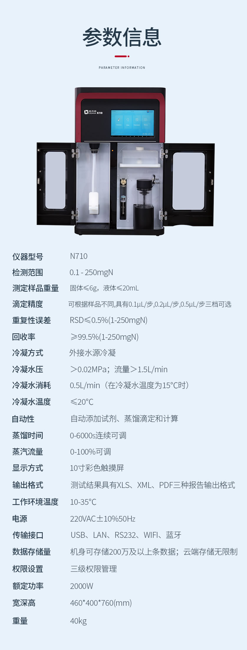 新一代N710全自動凱氏定氮儀集成了自動加堿加酸、自動加稀釋劑、蒸餾滴定、消化管排空、溶液液位監測、超溫監測、清洗排廢、結果計算等功能。采用符合國家標準的凱氏定氮方法:濃硫酸環境消解樣品、堿性環境蒸汽蒸餾、硼酸吸收、加指示劑滴定、終點顏色判定法。