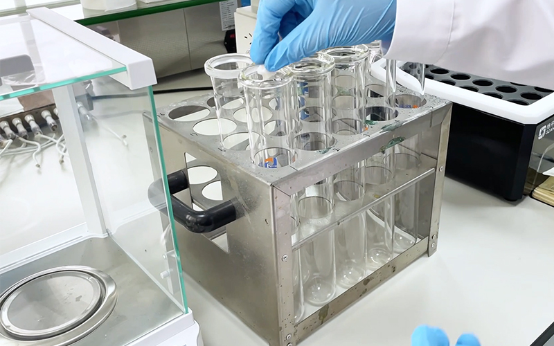 將樣品粉碎后混合均勻,稱取2.0g(精確至0.1mg),使用稱量紙包裹樣品,一同放入消化管中,加入混合催化劑片2片(或混合催化劑粉末3.2g),沿消化管壁加入濃硫酸15mL。