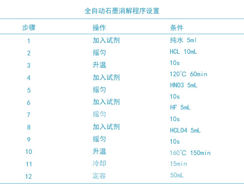 本次試驗(yàn)使用HCl-HNO3-HF-HClO4混合酸消解體系,將土壤中的晶格全部打開(kāi),進(jìn)行全消解。因用酸量較少,只需準(zhǔn)確稱取0.1000-0.2000g左右干燥土壤樣品至特氟龍消解管中,放入全自動(dòng)消解儀石墨孔中,設(shè)置好系統(tǒng)消解方法只需要一鍵啟動(dòng)就可以自動(dòng)加酸、搖勻、加熱消解、趕酸、定容。全自動(dòng)石墨消解儀系統(tǒng)的消解程序及條件見(jiàn)表下面表格。全自動(dòng)消解儀自動(dòng)定容到50mL,每批樣品加做雙份全程序空白。