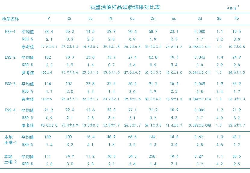 分別準(zhǔn)確稱取ESS-1、ESS-2、ESS-3、ESS-4、本地土壤-1和本地土壤-2各6份,樣品轉(zhuǎn)移至全自動(dòng)石墨消解儀樣品管中,放進(jìn)相應(yīng)的樣品位置,全自動(dòng)消解進(jìn)行前處理,統(tǒng)測(cè)定消解液中10種重金屬元素的含量。全自動(dòng)消解測(cè)定結(jié)果數(shù)據(jù)見(jiàn)下面表格。本方法測(cè)定的標(biāo)準(zhǔn)樣品均值都在保證值范圍內(nèi),準(zhǔn)確度可靠;相對(duì)標(biāo)準(zhǔn)偏差在0.5%-4.6%之間,具有較好的精密度。