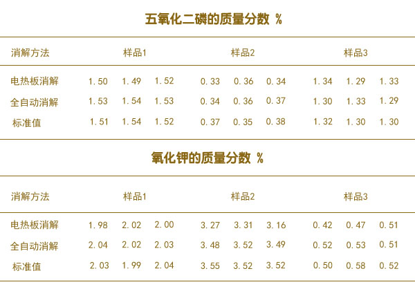 按照不同的濃度要求吸取不同量的磷、鉀標準溶液分別置于7個50mL容量瓶中,加水定容,得到不同濃度系列的全磷全鉀混合標準溶液系列。將有機肥料樣品1號、2號、3號樣品分別采用電熱板消解、全自動石墨消解儀消解,采用ICP-OES分別對樣品進行三次讀數(shù)。有機肥料中的五氧化二磷及氧化鉀(以烘干基計)平均質量分數(shù)測定結果見表。