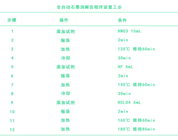 (2)全自動(dòng)消解儀消解法具有操作簡便、程序自動(dòng)化、無需人員值守等優(yōu)點(diǎn)。本實(shí)驗(yàn)中全自動(dòng)消解儀消解法采用HNO3+HF+HClO4體系,為研究實(shí)驗(yàn)提供經(jīng)驗(yàn)。
