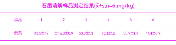 采用上述的方法對紫菜(各6份)進行測定,測定結果為3次測定的平均值及標準偏差范圍,結果見表【石墨消解樣品的測定結果】。紫菜總砷含量范圍為33.5~72.1mg/kg。