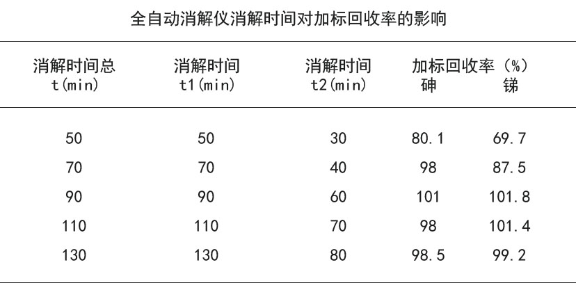 消解時(shí)間包括消解時(shí)間和趕酸時(shí)間,消解和趕酸不完全均影響樣品中As和Sb含量的測(cè)定。鑒于沒有尿樣的標(biāo)準(zhǔn)對(duì)照樣,實(shí)驗(yàn)中在尿樣加標(biāo)5μg/L的As和Sb標(biāo)準(zhǔn)混合液,通過計(jì)算回收率來考察消解時(shí)間對(duì)實(shí)驗(yàn)過程的影響。根據(jù)電熱板消解經(jīng)驗(yàn)確定幾種消解方案,在加6.0ml濃HNO3和1.5ml HClO4的情況下,考察了消解時(shí)間(總t)對(duì)加標(biāo)回收率的影響,其中t=t1+t2,消解時(shí)間(總t)在70~130min時(shí)As的加標(biāo)回收率滿足條件,在消解時(shí)間(總t)90~130min時(shí)Sb的加標(biāo)回收率滿足實(shí)驗(yàn)條件,故選擇消解時(shí)間(總t)為90min,見下表。