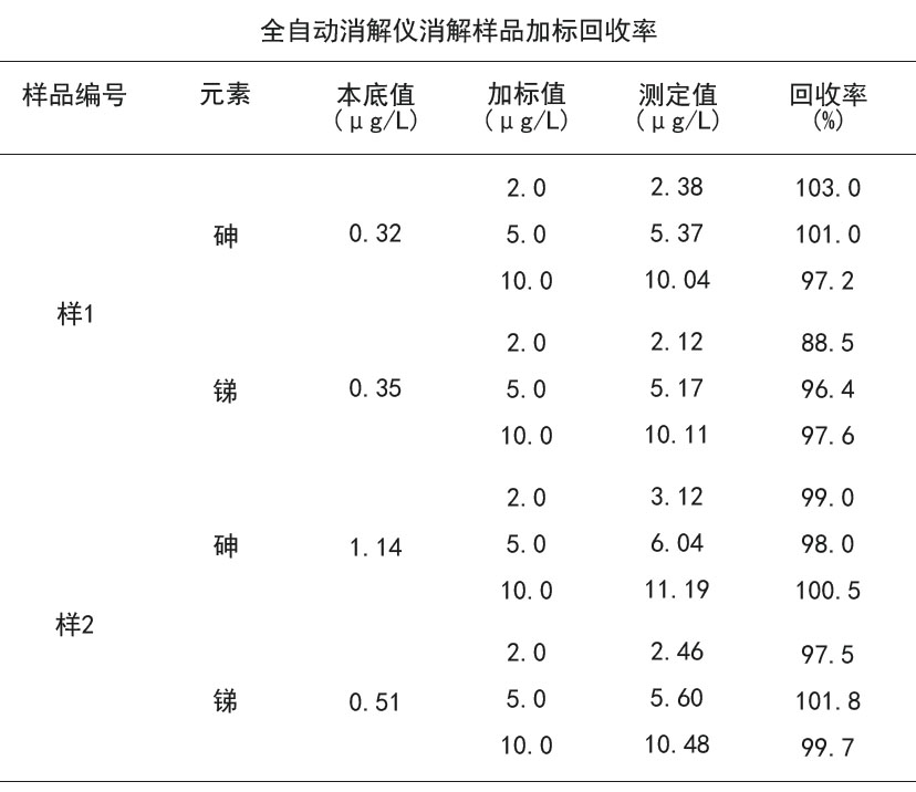 在實(shí)際2份尿樣中加入一定濃度的As和Sb標(biāo)準(zhǔn)溶液,測(cè)定樣品的加標(biāo)回收率,結(jié)果為As的回收率在97.2~103%之間,Sb的回收率在88.5~101.8%之間,見下表。