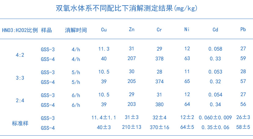 通過硝酸和雙氧水不同配比下的消解,對比兩種消解酸體系的實驗結果如下表。由表中數據可知,硝酸-氫氟酸-雙氧水體系均可以滿足銅、鋅、鉛、鎘、鉻、鎳6種重金屬元素的測定,而配比為4:2的體系消解時間更短,加入過氧化氫的次數少,這是因為過氧化氫的氧化能力隨介質的酸度增加而增加,在HNO3:H2O2配比為4:2的配比下,氧化效率更高,確定該比例為佳比例。