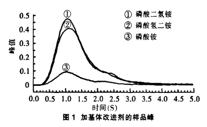 試驗分別吸取5mL 5%硝酸鎂、磷酸二氫銨、磷酸氫二銨、磷酸銨作為基體改進劑對鉻標樣及樣品進行測定,其基改劑的上機濃度為1%(體積分數(shù))。結果(表1)表明,硝酸鎂作為基改劑時,標樣響應值較高,標樣與樣品測量值偏高;而選用磷酸二氫銨、磷酸氫二銨、磷酸銨為基改劑時,響應峰峰形好(圖1),測定結果沒有差異,回收率也在范圍內。但選用的磷酸二氫銨、磷酸氫二銨溶液作空白測 定時,空白值偏高。因此,選擇5%磷酸銨作為鉻測定的基體改進劑,這與國標法選用的一致。