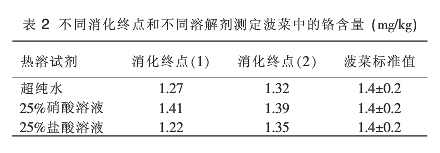 以菠菜標準物質(GBW 10015)為研究對象,加入6mL混合酸與電熱板消解。消化終點按以下2種方案進行:(1)消化至冒濃白煙,消化液0.5mL左右;(2)消化至近干,沒有流動的消化液。取下稍冷,將以上2種不同消化方案得到的消化液分為3個試驗組。各試驗組分別加入1mL超純水、1mL 25%硝酸溶液、1mL 25%鹽酸溶液進行熱溶解,超純水定容至25mL,于原子吸收分光光度計上測定各樣品中鉻含量,并確定消化終點及助溶劑,進而確定預處理方法。