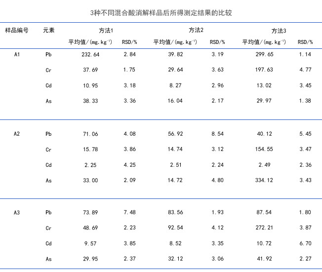 表2所示為3種不同混合酸消解樣品后所得測定結(jié)果的比較。