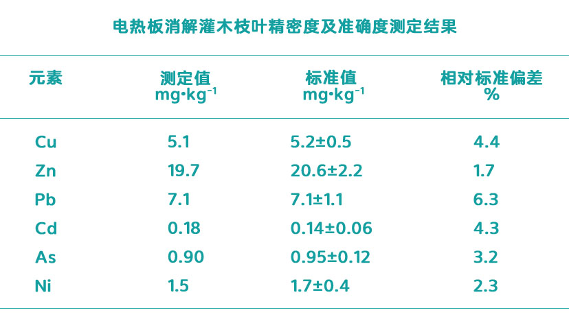 為了試驗實驗方法的精密度及準確度對國家標準物質灌木枝葉(GBW07602)標樣進行消解測定,將樣品稱取6份,按電熱板消解方法進行消解測定,測定結果見“電熱板消解灌木枝葉消解測定精密度和準確度結果”表。