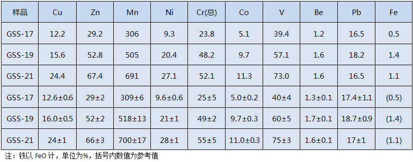 用HCl+HNO3+HF+HC104四酸全消解體系通過陶瓷電熱板濕法消解土壤樣品,進行3種不同加酸過程對GSS-17、GSS-19和GSS-21標準土壤樣品進行3次平行預處理,測定土壤中銅、鋅、錳、鎳、總鉻、鉆、釩、鈹、鉛、鐵l0種重金屬元素,結果如下表所示。