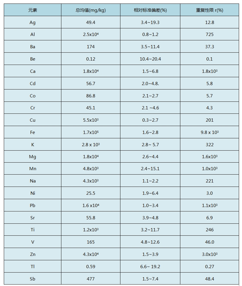 從表中看出相對標準偏差范圍分別為:1.1%~22.6%,數據可靠,符合實驗室對固廢消解要求。