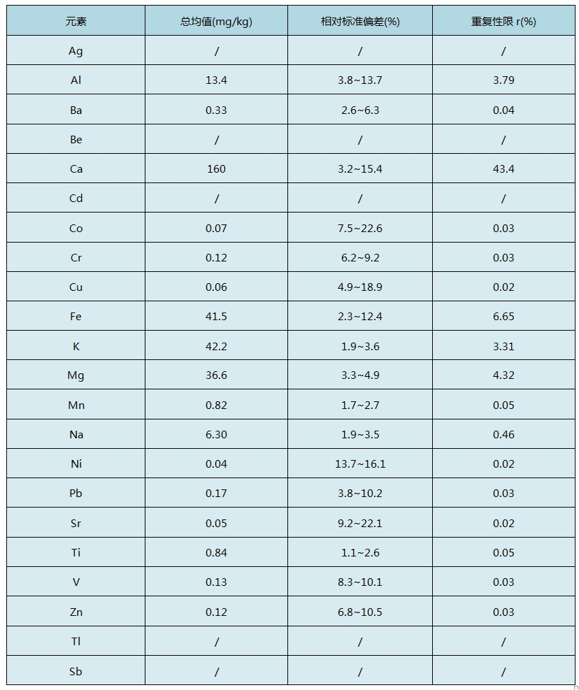 采用固廢消解步驟五中的方法對固體廢物中22種金屬元素浸提液標準樣品ISS-2樣品進行消解,經過6次測定分析得出精密度結果如下表: